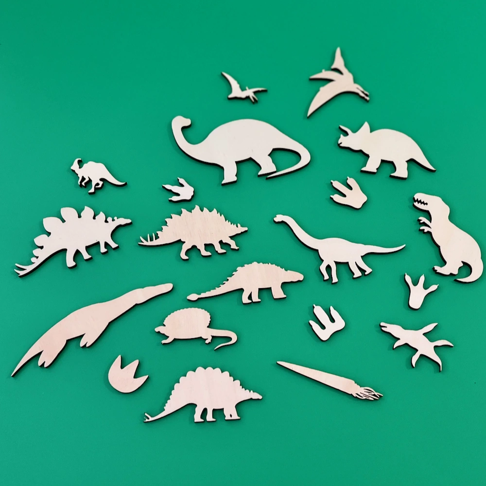 Sada výřezů dinosaurů a jejich stop.