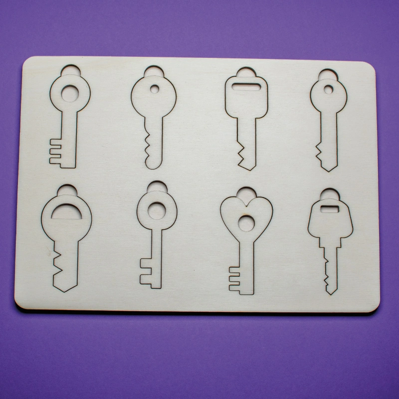 Deska s 8 klíči pro nácvik vkládání.Rozvíjí jemnou motoriku, rozlišování velikostí a tvarů.