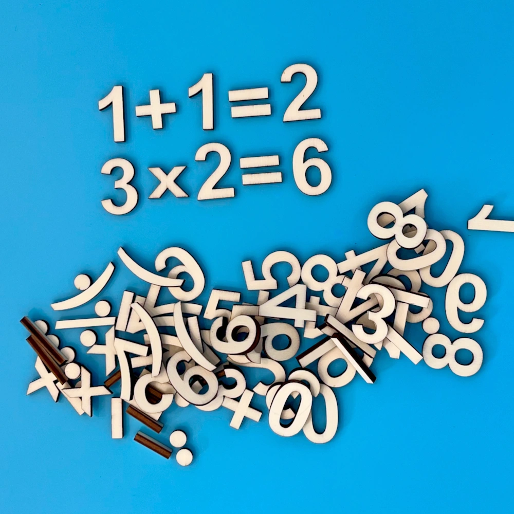 Sada obsahuje: číslice 0 (4ks), číslice 1 (8 ks), číslice 2 (4 ks), číslice 3 až 9 (4 ks) + zaménka (x, +, :, =, -)