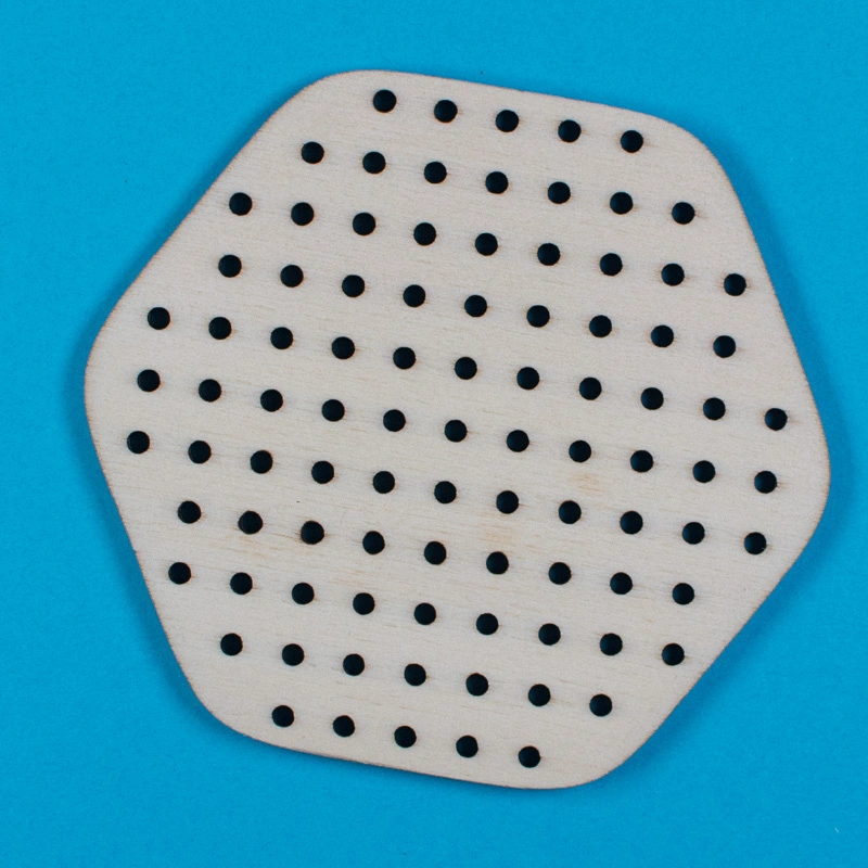 Vyšívací destička ve tvaru šestiúhelníku k procvičování jemné motoriky.
