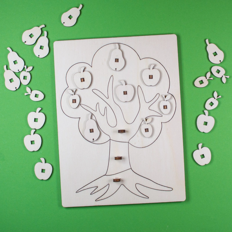 Vkládačka pro znázornění a výuku jednotlivých částí stromu a jejich plodů.