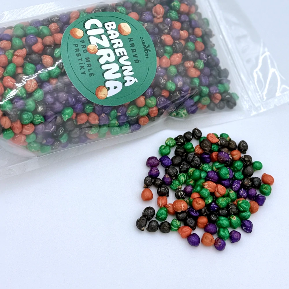 Každý sáček obsahuje ručně barvenou cizrnu bezpečnými barvivy splňujícími normu EN 71-3 o bezpečnosti dětských hraček. Materiál je příjemný na dotek, šustí a děti láká k objevování, přesypávání a třídění.