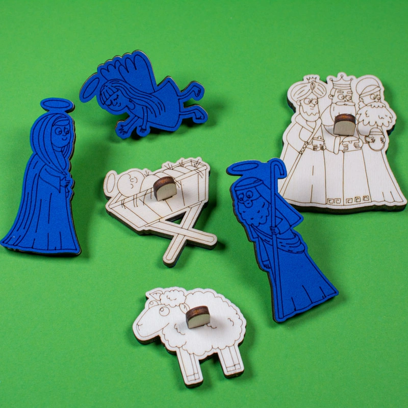 Tato sada pěnových razítek s dřevěnou úchytkou je krásnou a kreativní pomůckou pro tvoření s vánoční tematikou. Motivy Marie, Josefa, Ježíška, tří králů, anděla a ovečky dětem umožní vytvářet vlastní betlémy, přáníčka, dekorace či tematické obrázky.