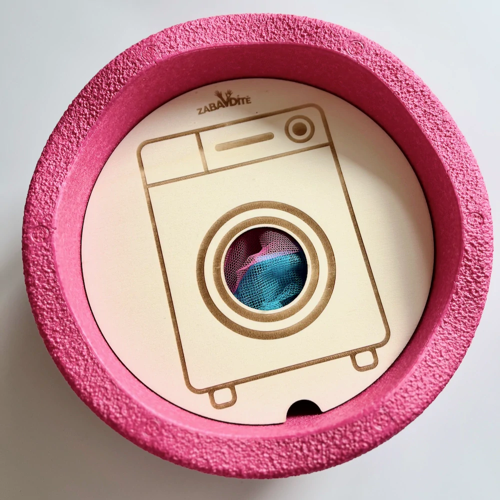 Dřevěná vkládací deska s motivem pračky je navržena jako rozšíření pro balanční kameny. Otvor v bubnu pračky umožňuje dětem vkládat malé předměty, což přináší nejen zábavu, ale také podporuje jejich jemnou motoriku a koordinaci pohybů. Díky gravírovanému designu mohou děti procvičovat také vizuální vnímání a představivost.