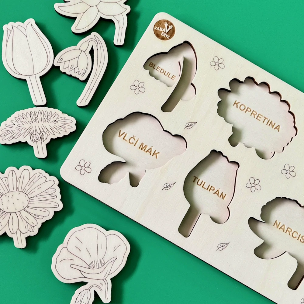 Dřevěná vkládačka s motivy květin pomáhá dětem hravou formou poznávat různé druhy květin. Vkládačka umožňuje naučit se rozeznat šest známých jarních rostlin: bledule, kopretina, pampeliška, vlčí mák, tulipán a narcis.