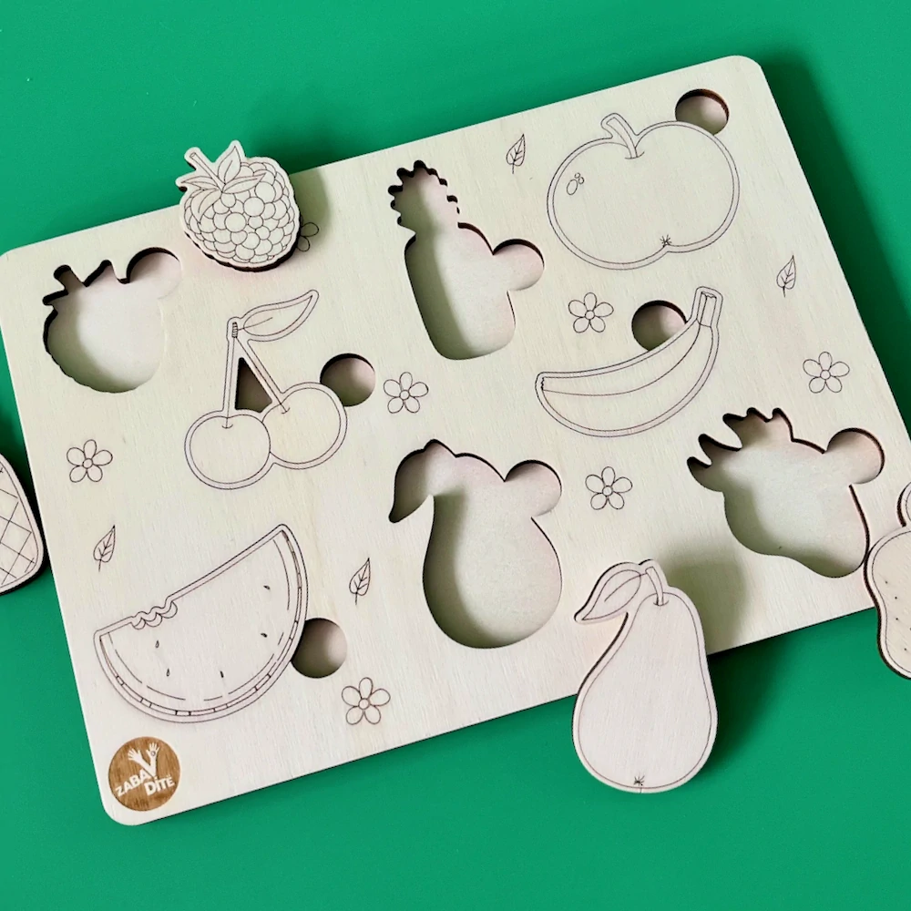 Dřevěná vkládačka s motivy ovoce pomáhá dětem rozpoznávat různé druhy ovoce a rozvíjet jemnou motoriku. Každý dílek odpovídá konkrétnímu tvaru na desce, což dětem umožňuje snadno rozlišovat jednotlivé tvary a učit se jejich názvy. Obrázky lze domalovat pastelkami, temperami nebo barvami na dřevo, což přináší další možnosti tvořivých aktivit.