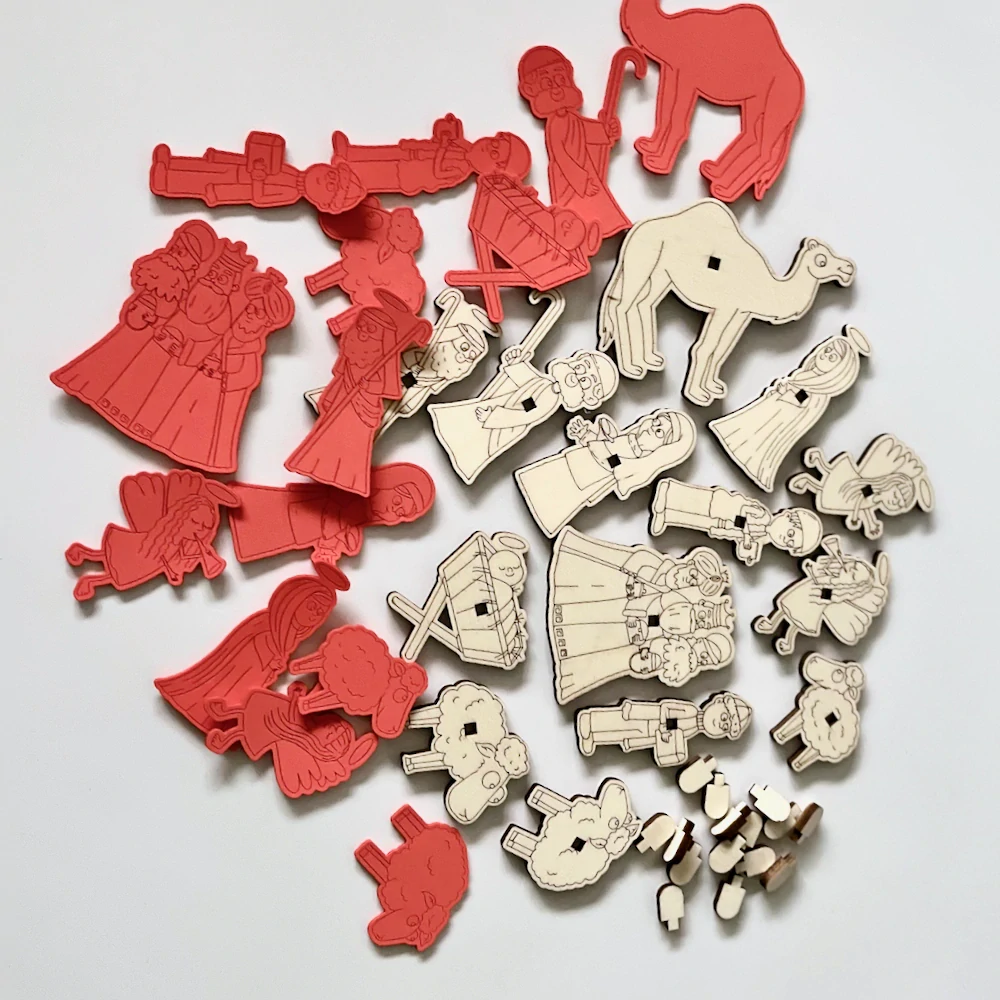Po dokončení získáte plnohodnotná razítka, která skvěle tisknou na papír, karton i lehce nerovné povrchy, jako je textil nebo dřevo. Hotová sada zahrnuje všechny hlavní postavy z betléma – ideální pro vánoční tvoření, adventní aktivity i doplnění smyslových her.