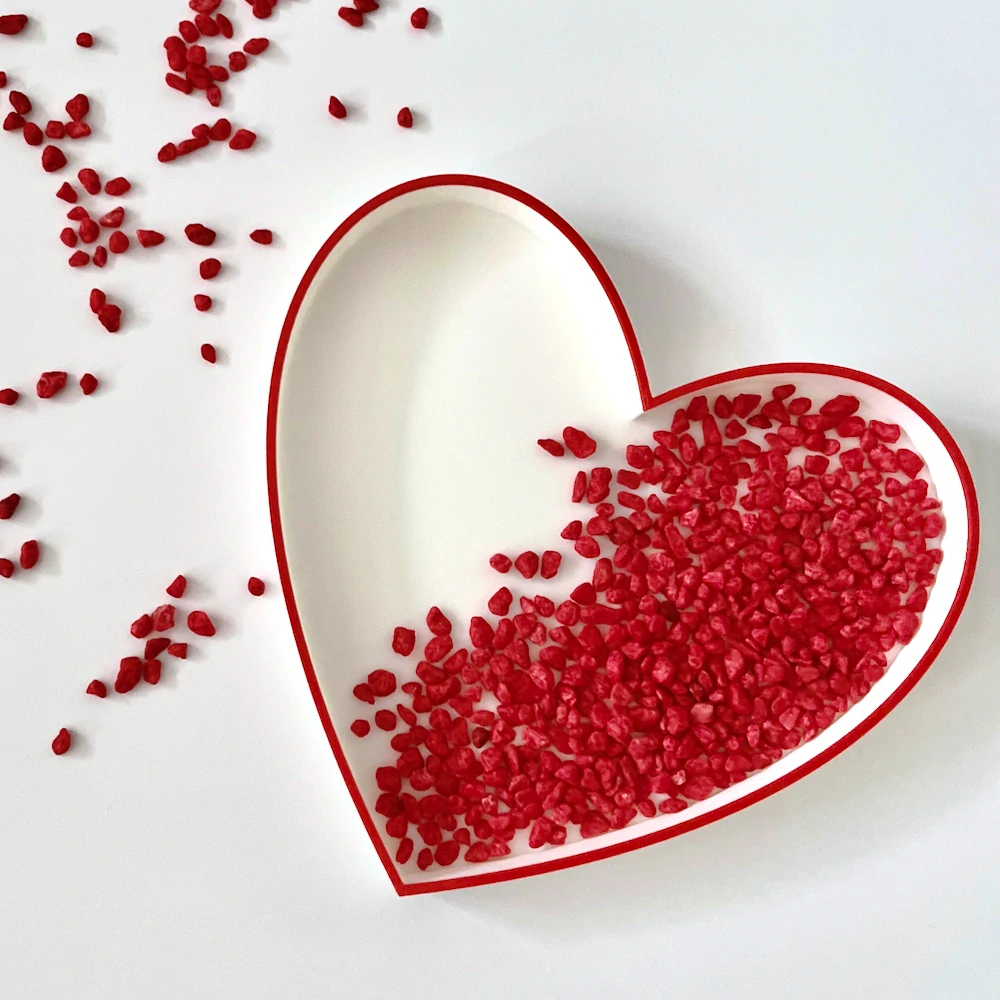 Senzorický tác ve tvaru srdce je navržen pro smyslové hry, které podporují jemnou motoriku a kreativitu. Děti do něj mohou vkládat drobné předměty, jako jsou kamínky nebo cizrna, a objevovat různé textury. Tác je vyroben z PLA pomocí 3D tisku, hodí se proto na aktivity s vodou či šumivými prášky.