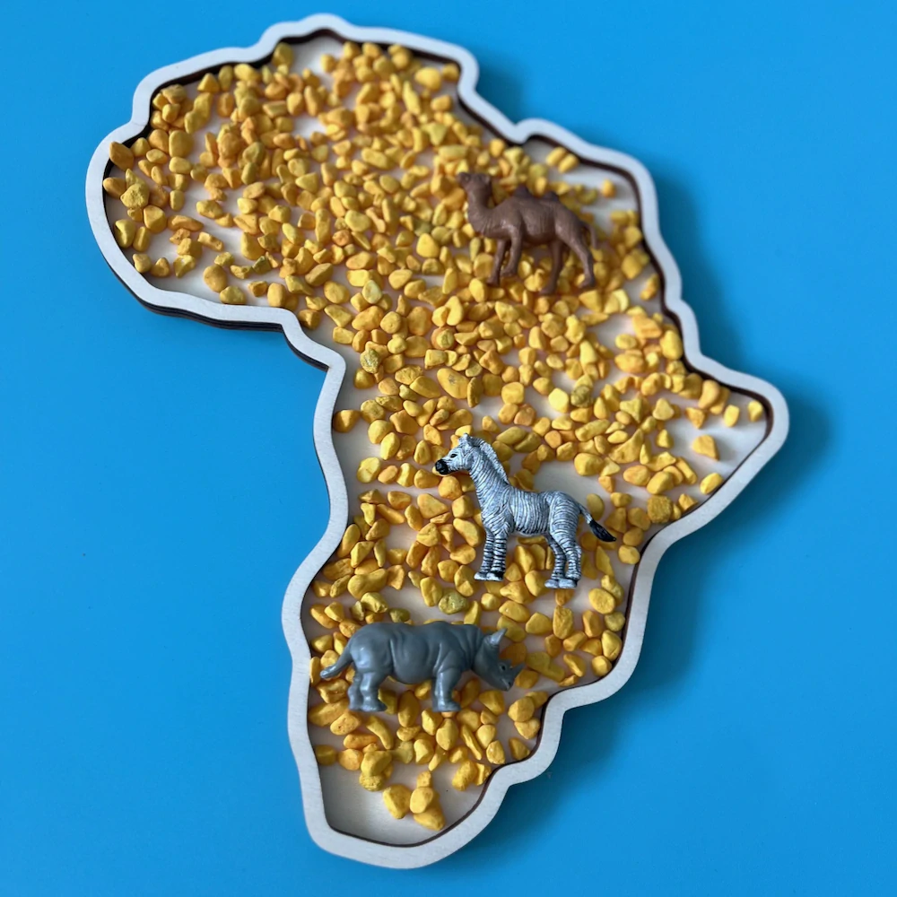 Třídící dřevěný tác ve tvaru Afriky – Pomůcka pro smyslovou hru (sensory play)
