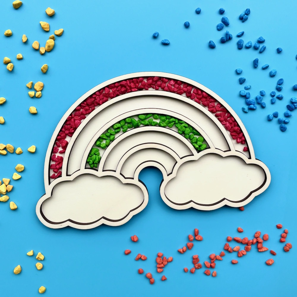 Třídící dřevěný tác ve tvaru duhy je skvělým nástrojem pro smyslovou hru, která zábavným způsobem rozvíjí smysly dětí, včetně hmatu, zraku, sluchu a dalších. Děti mohou do oddílů duhy umisťovat drobné předměty, jako je cizrna, čočka, rýže nebo kukuřice, což podporuje jemnou motoriku a jejich kreativitu. Smyslová hra také pomáhá rozvíjet jazykové, myšlenkové a sociálně-emocionální dovednosti.