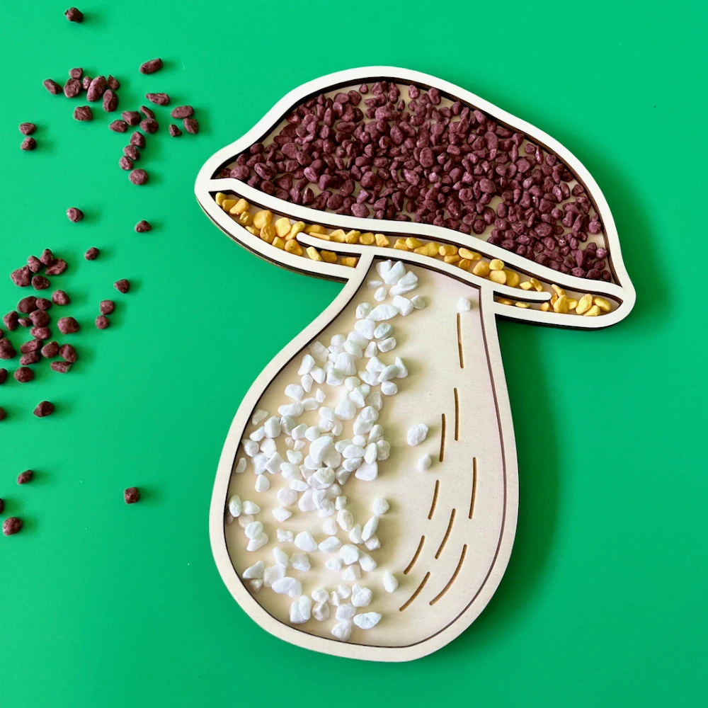 Třídící dřevěný tác ve tvaru hřibu je navržen pro smyslovou hru (sensory play), která podporuje rozvoj dětských smyslů jako hmat, zrak, sluch a další. Děti mohou do prostoru na tácu vkládat různé drobné předměty, kamínky nebo písek, což přispívá k rozvoji jejich kreativity, koordinace a jemné motoriky. Sensory play dále napomáhá rozvoji jazykových, myšlenkových a sociálně-emocionálních dovedností.