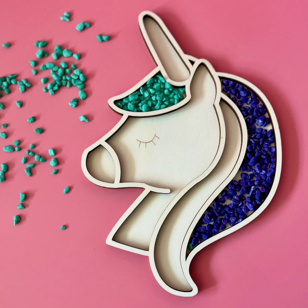Třídící dřevěný tác ve tvaru jednorožce – Pomůcka pro smyslovou hru (sensory play)
