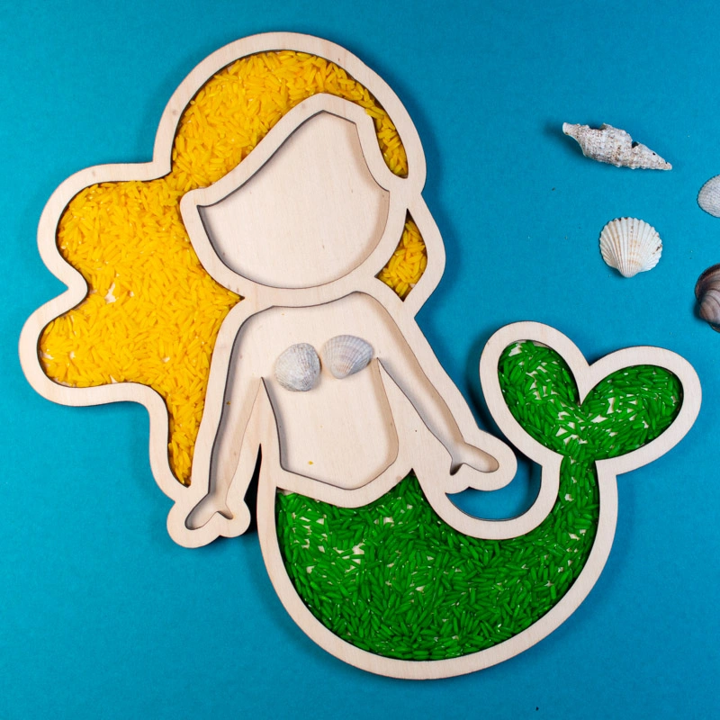 Třídící dřevěný tác ve tvaru mořské panny – Pomůcka pro smyslovou hru (sensory play)