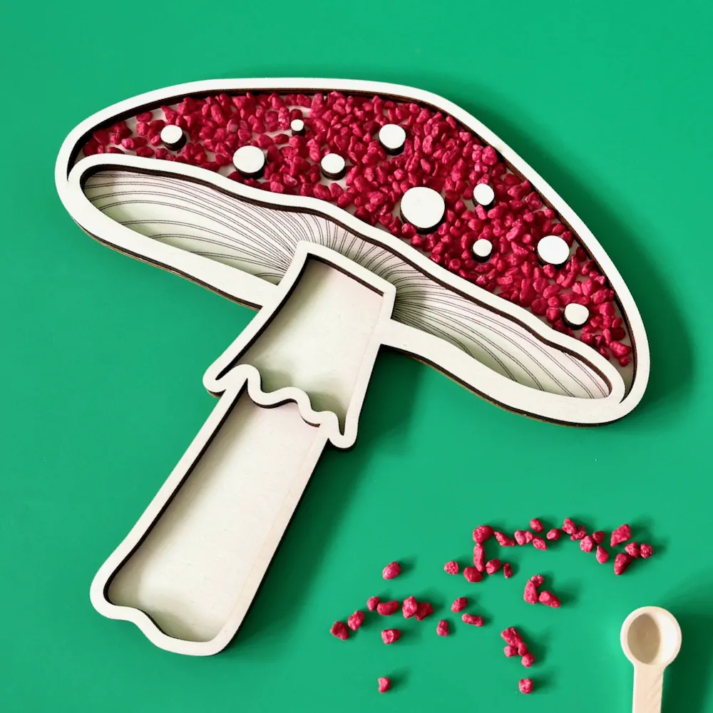 Dřevěný tác ve tvaru muchomůrky je ideální pomůckou pro děti, které rády objevují svět pomocí smyslové hry. Je vhodný pro domácí použití, školky i Montessori prostředí, kde pomáhá rozvíjet důležité dovednosti zábavným a interaktivním způsobem.