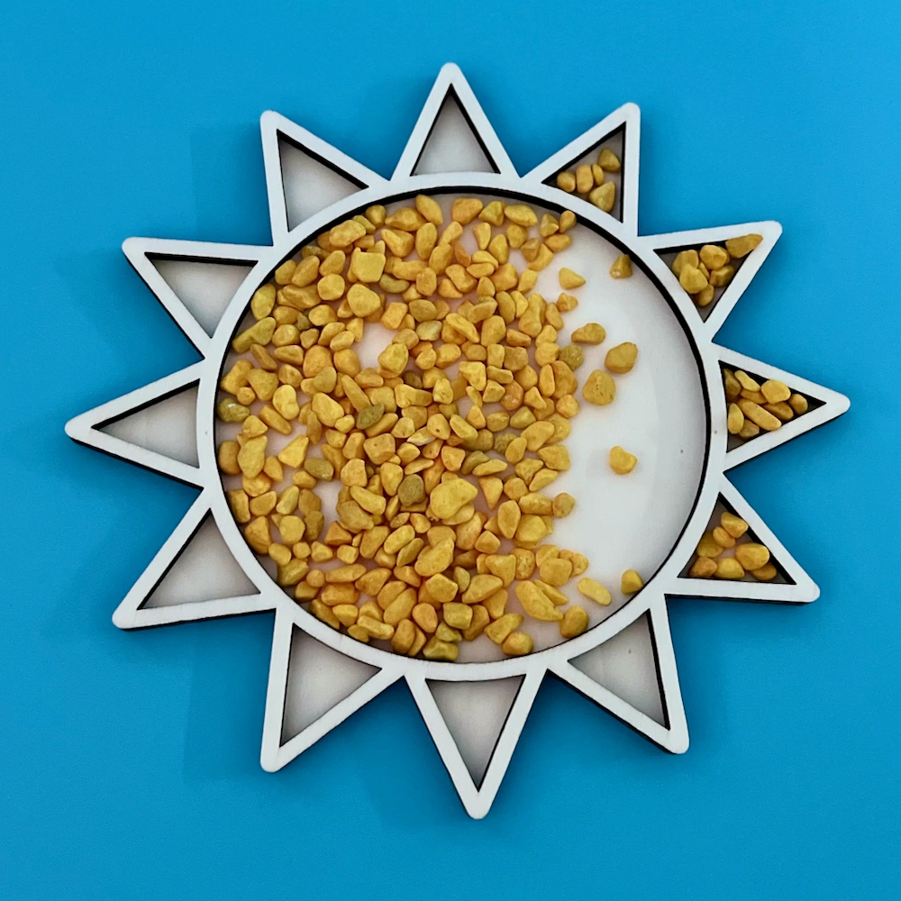 Třídící dřevěný tác ve tvaru slunce – Pomůcka pro smyslovou hru (sensory play)