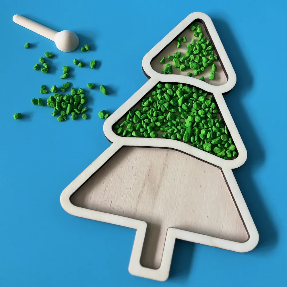 Třídící dřevěný tác ve tvaru stromu – Pomůcka pro smyslovou hru (sensory play)