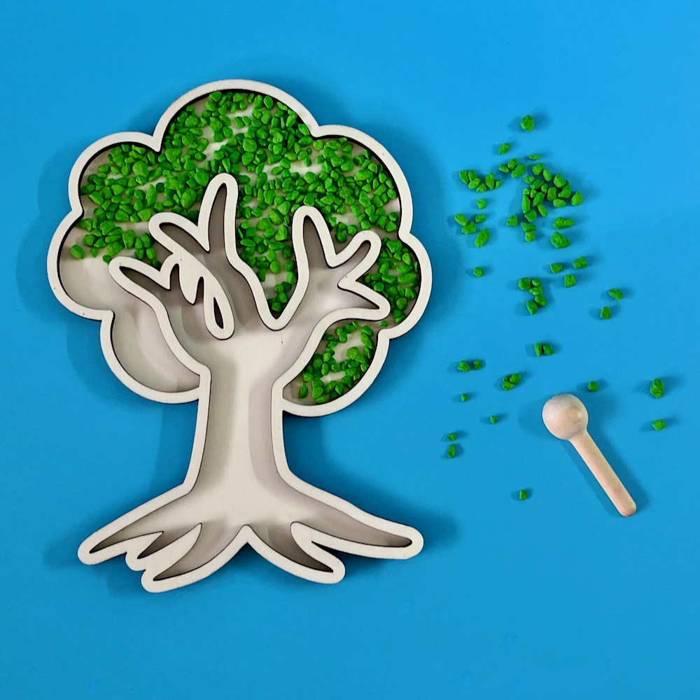 Třídící dřevěný tác ve tvaru listnatého stromu – Pomůcka pro smyslovou hru (sensory play)