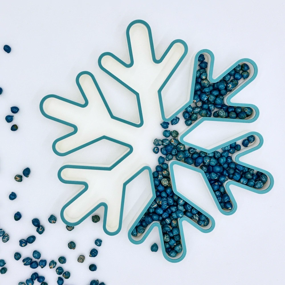 Senzorický tác ve tvaru sněhové vločky je ideální zimní pomůckou pro tvoření, objevování a smyslové hraní. Díky členitému tvaru a hlubokým zónám děti mohou vločku zaplňovat různorodými materiály – od rýže a čočky po třpytivé korálky, pěnu nebo metalickou cizrnu. Tác stimuluje jemnou motoriku, podporuje trpělivost i koncentraci a navíc přináší estetický zážitek z kombinování zimních odstínů.