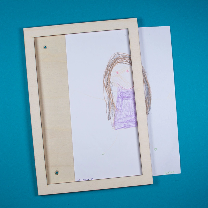 Rámeček dle návrhu Terezy Rak s možností snadné výměny obrázků. Rámeček je pro formát obrázku A4 (pojme více než 10 listů 80g papíru). Zadní deska je lakovaná, papír díky tomu zvládnou vysunout i malé děti.