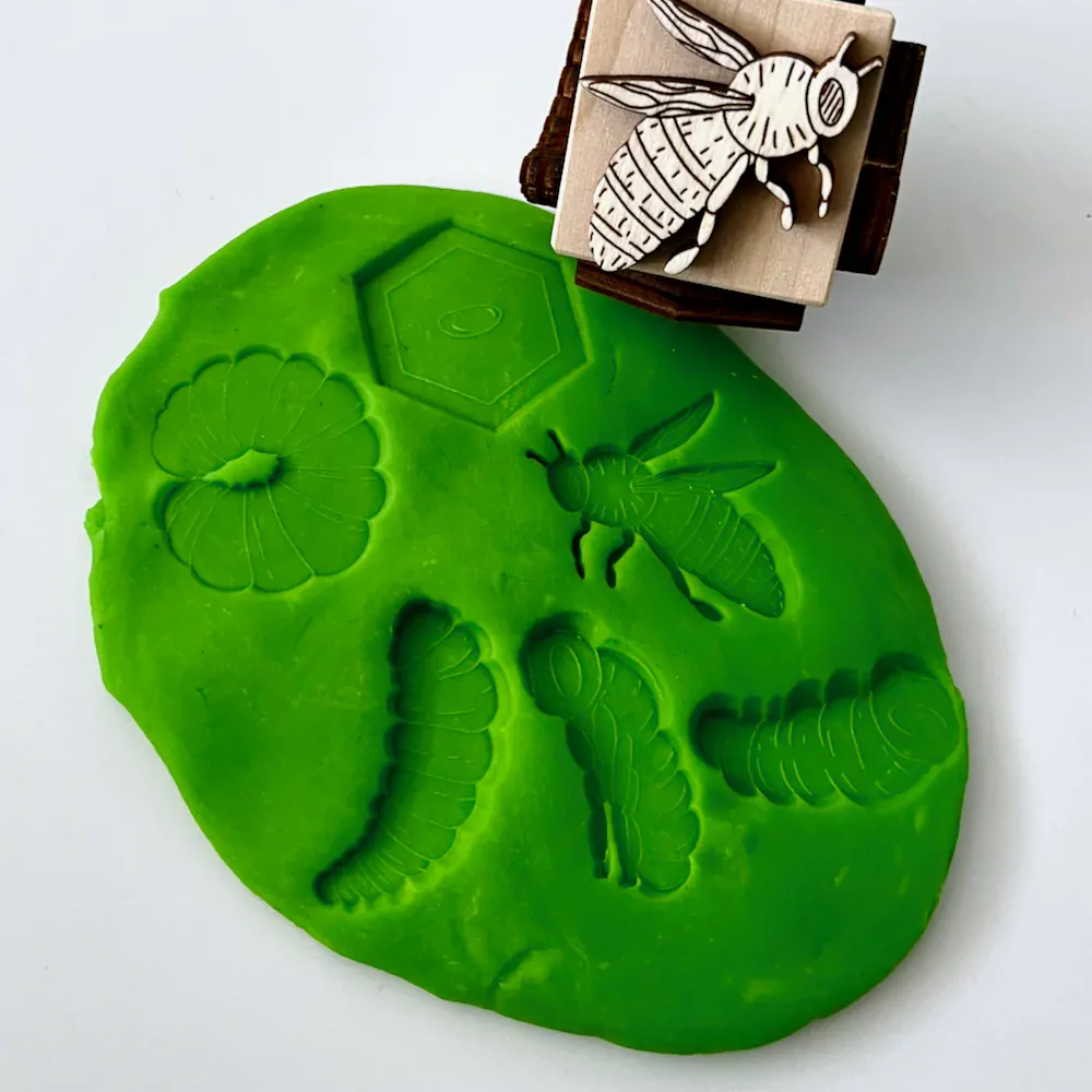 Dřevěná obtiskávací kostka se 6 vývojovými stádii včely