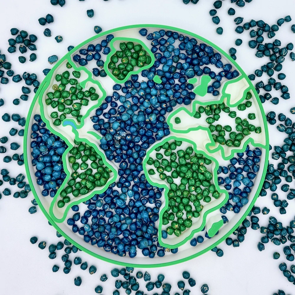 Vyplňte oceány modrou rýží a kontinenty zelenou cizrnou. Děti si tak mohou vytvořit vlastní barevnou planetu a zároveň si povídat o tom, kde žijí lidé, zvířata nebo jaké počasí je na různých místech světa.